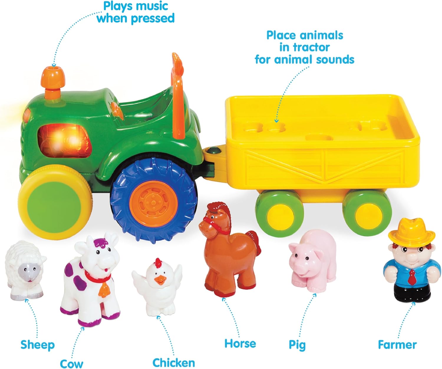 - PRODUCT SPECIFICATIONS: Package includes (1) tractor, (1) trailer, (1) farmer, (5) animals – horse, sheep, cow, chicken and pig. Requires 3 AA batteries (included). Suitable for children 12 months and up.