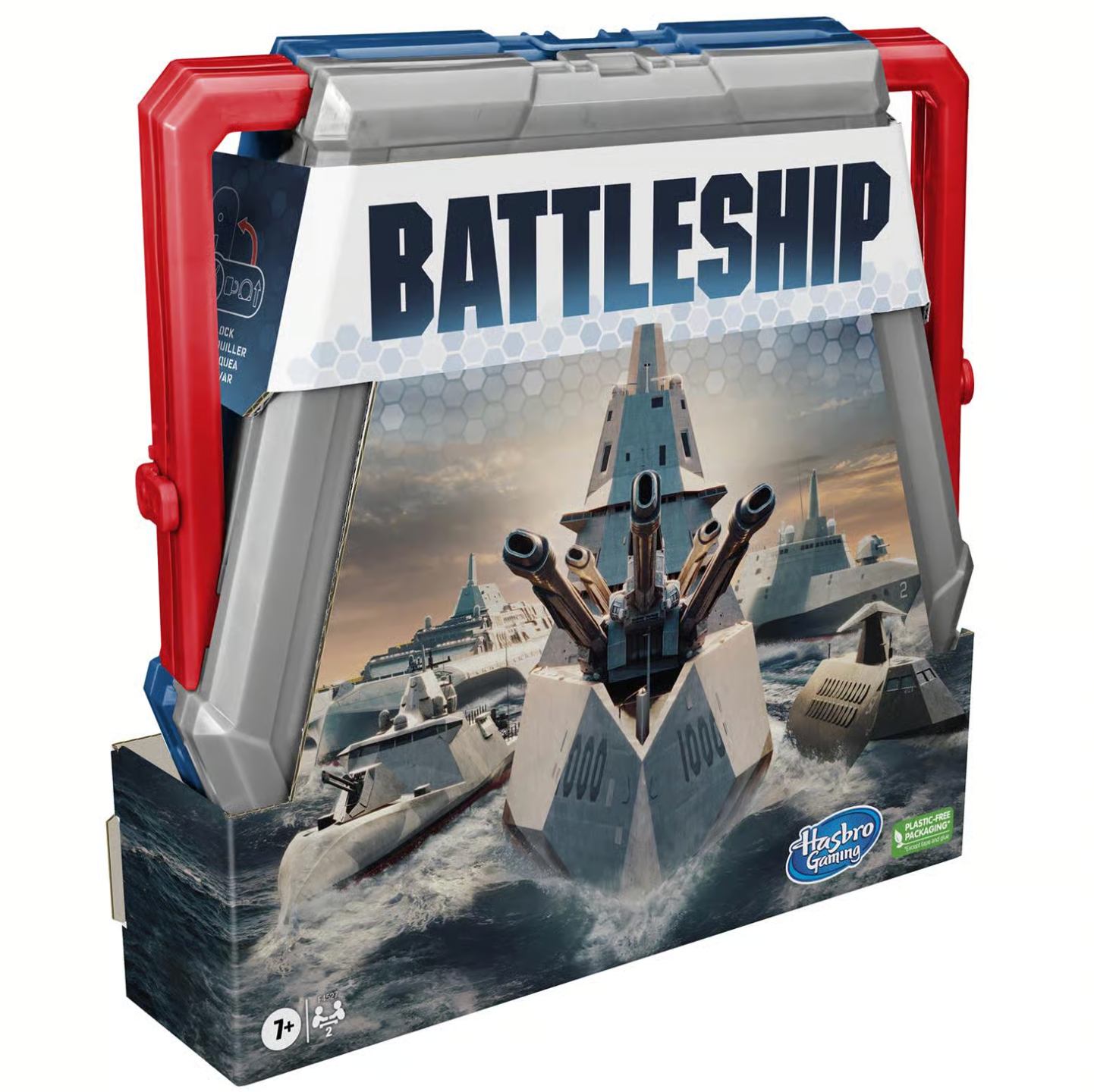 This Battleship board game is a classic game of naval combat that brings together competition, strategy, and excitement. In a head-to-head battle, players search for the enemy fleet of ships and destroy them one by one. With convenient portable battle cases and realistic-looking naval crafts, the Battleship game puts players right in the middle of the action. Players command a powerful fleet that includes an aircraft carrier, a destroyer, a submarine, a patrol boat, and a battleship. Each player announces the coordinates of each strike and sees if it hits. Position ships strategically to survive an opponent's relentless strikes, and track hits and misses with red and white pegs on the ocean grid. No ship is safe in this game of stealth and suspense. It's a fun indoor activity for kids ages 7 and up, and it's easy to pack up and take on the go.