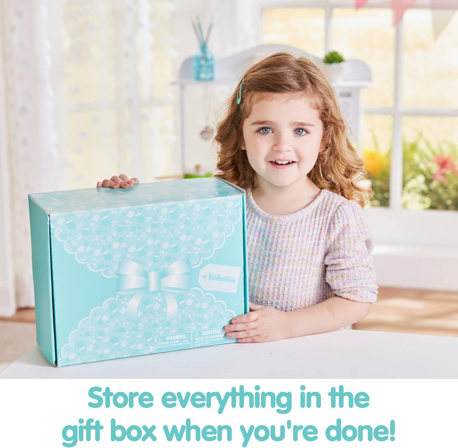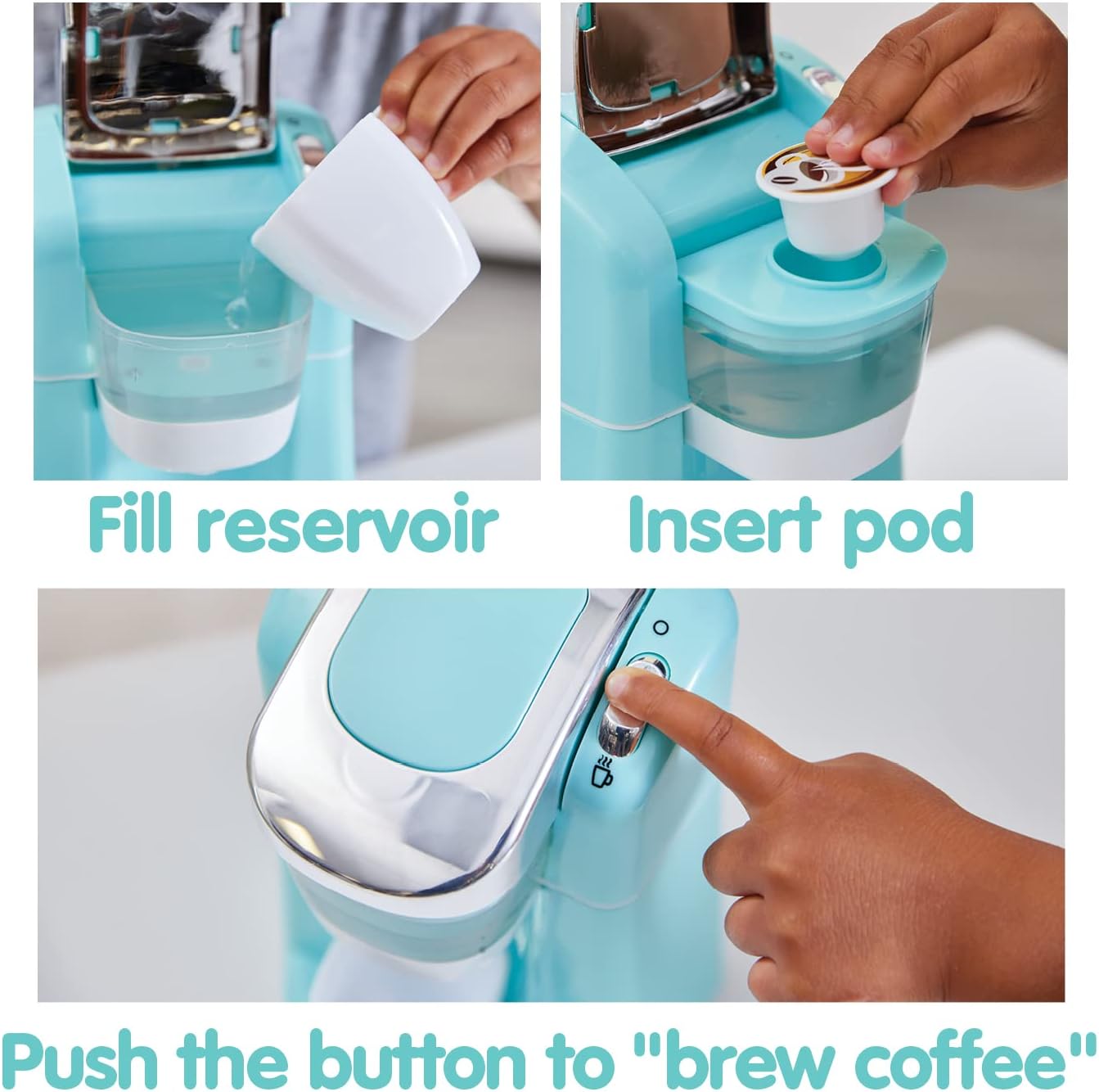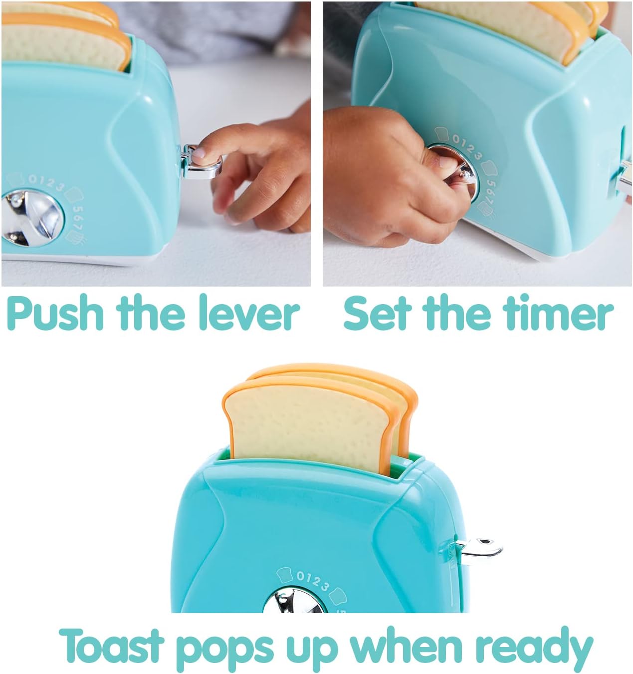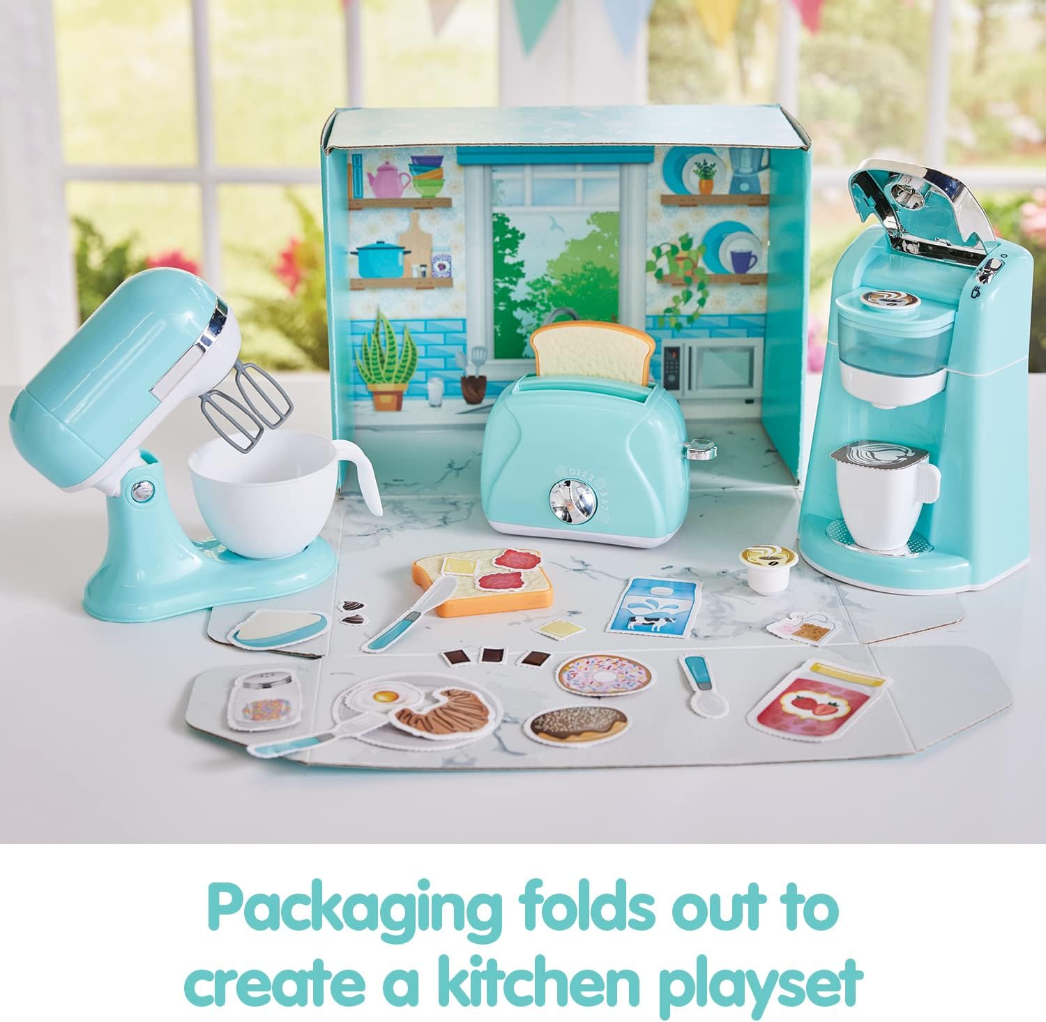Trendy Kitchen Trio Experiential Package from Kidoozie is a set of Three Realistic Toy Kitchen Appliances with Sleek Design including Coffee Maker, Toaster and Stand Mixer. Pretend kitchen play! Fill the reservoir with water, insert pod and push the button to "brew" coffee! Coffee maker makes realistic brewing sounds. Push the lever and set the timer to "toast" bread. Bread will pop up out of the toaster! Stand Mixer features tilt-head design for placing and removing the bowl from the stand. Turn the mixer on to watch the whisks rotate! The packaging folds out to become part of the playset. Includes 3 sheets of pop-out food & accessories to help complete the play! Requires 4 "AAA" batteries, not included.